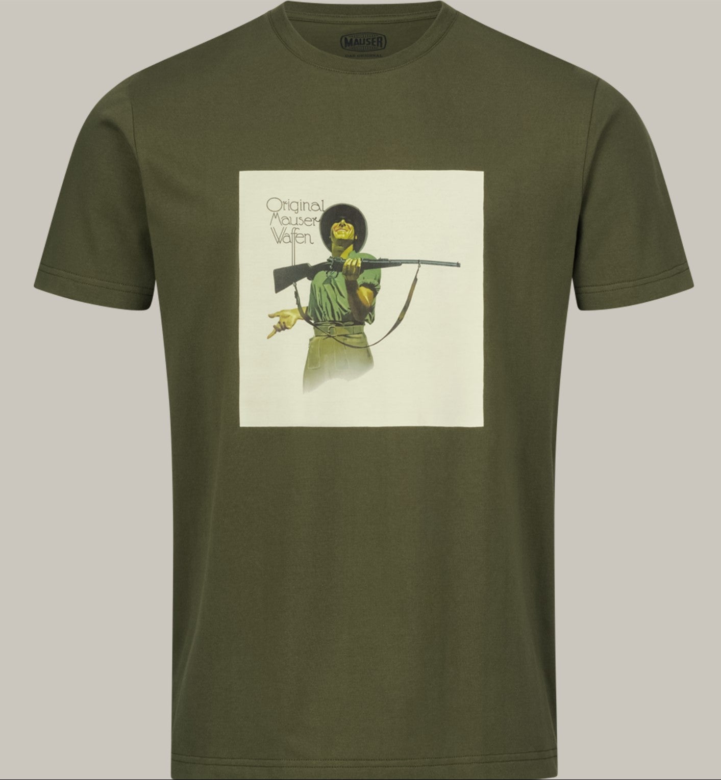 MAUSERの伝説的なボルトアクションライフル「MAUSER Mann」の精密さと耐久性を称える、クラシックなデザインのTシャツです。フロントには「MAUSER Mann」のプリントが施され、ブランドの歴史と誇りを象徴しています。